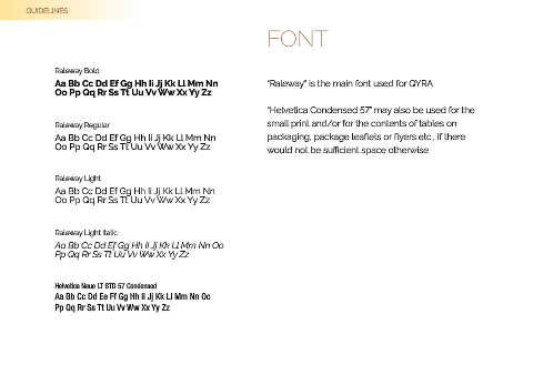 Aa Bb Cc Dd Ef Gg Hh Ii Jj Kk Ll Mm Nn “Raleway” is the main font used for QYRA.
