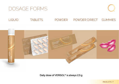 DOSAGE FORMS LIQUID TABLETS POWDER POWDER DIRECT GUMMIES Daily dose of VERISOL is always 2,5 g ® PRODUCTS | 7